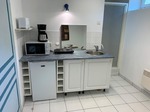 La kitchinette équipée se trouve à proximité du coin repas et du salon dans lequel nous mettons à votre disposition un canapé-lit et une télévision.